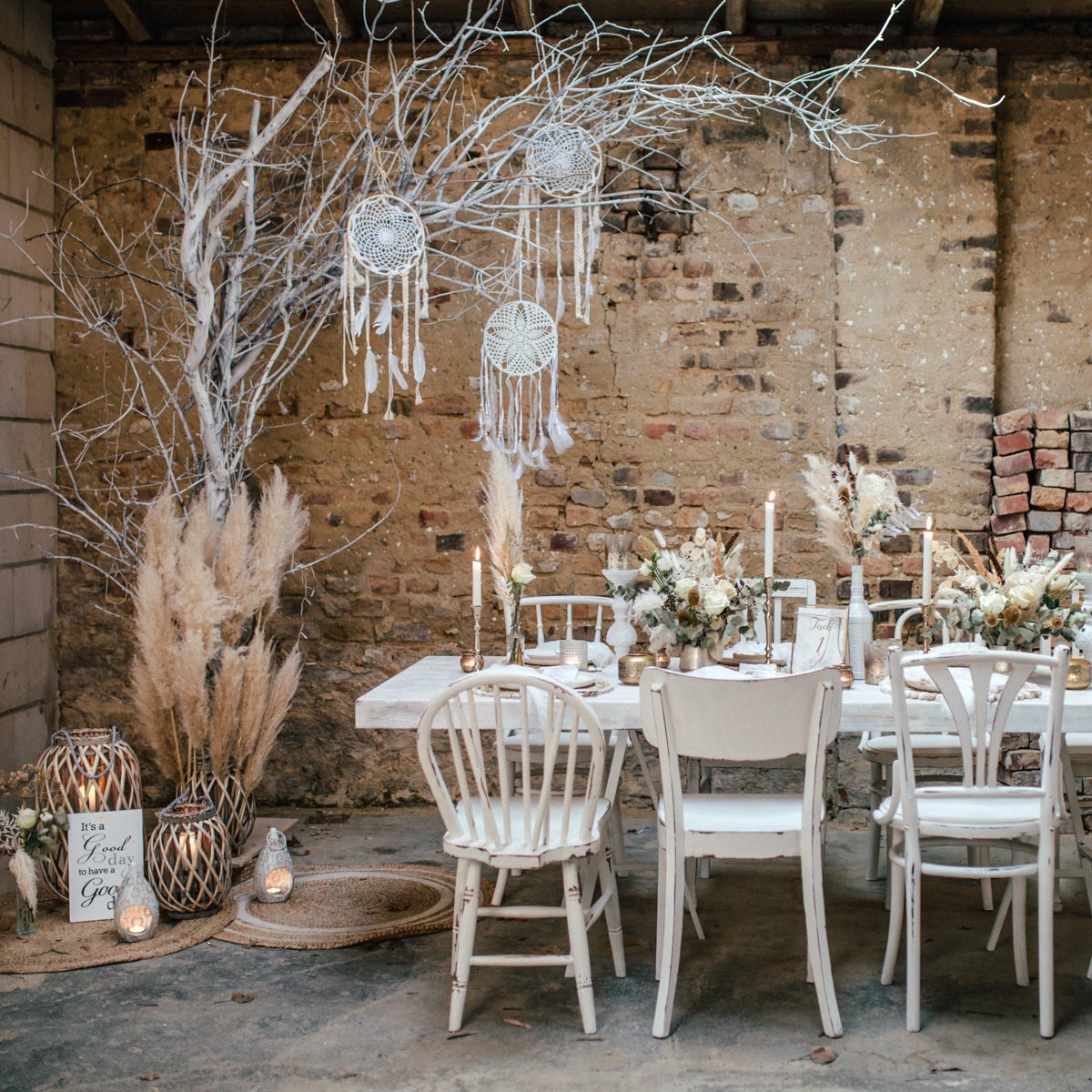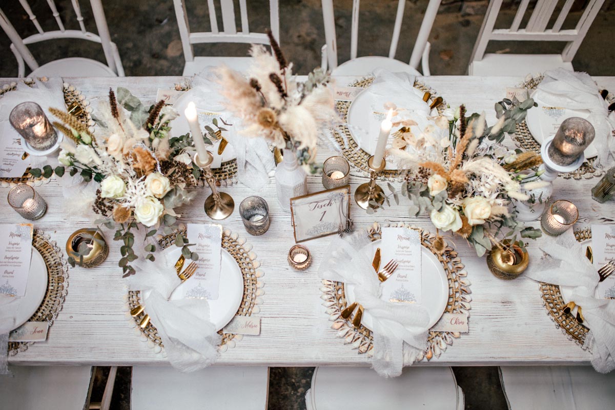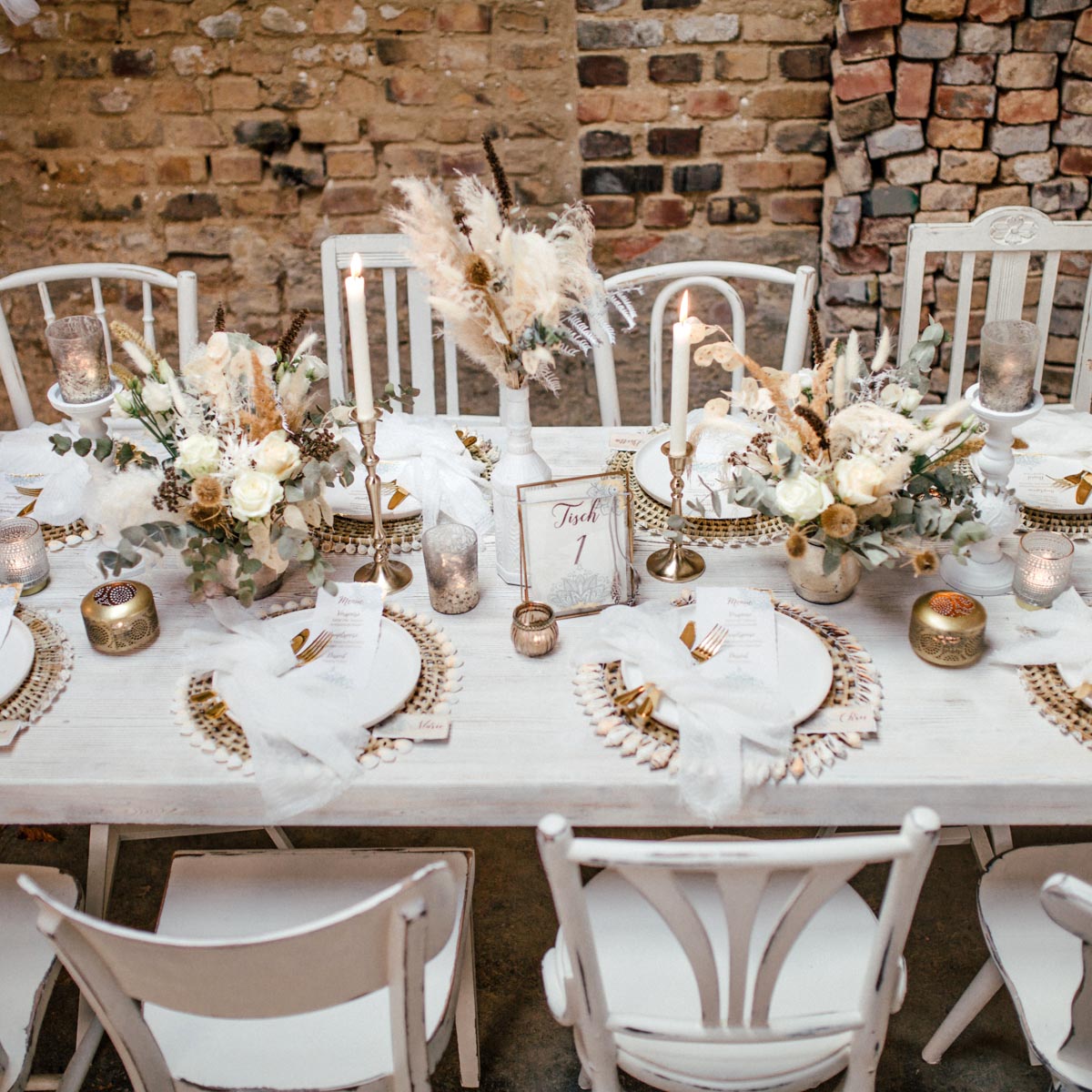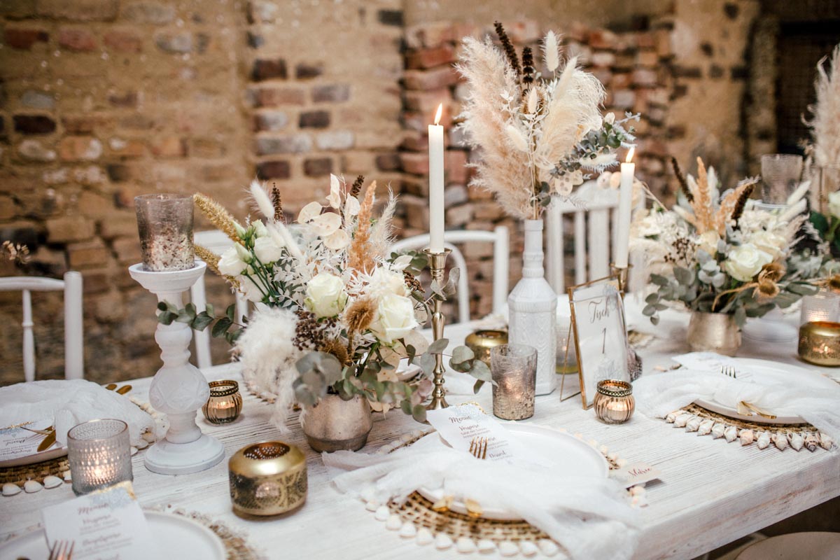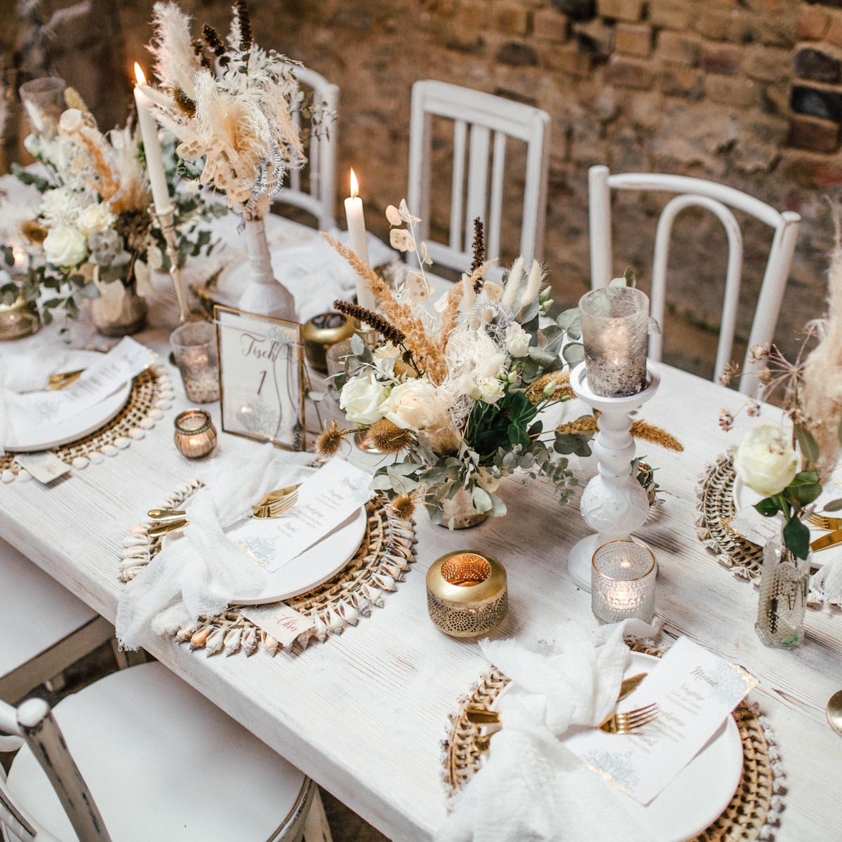 Sanftes Weiß, luftige Stoffe und feines Pampasgras verschmelzen mit liebevoll ausgewählten Vintage-Elementen. Zarte goldene Akzente setzen warme Highlights und lassen diesen Stil neu aufleben.