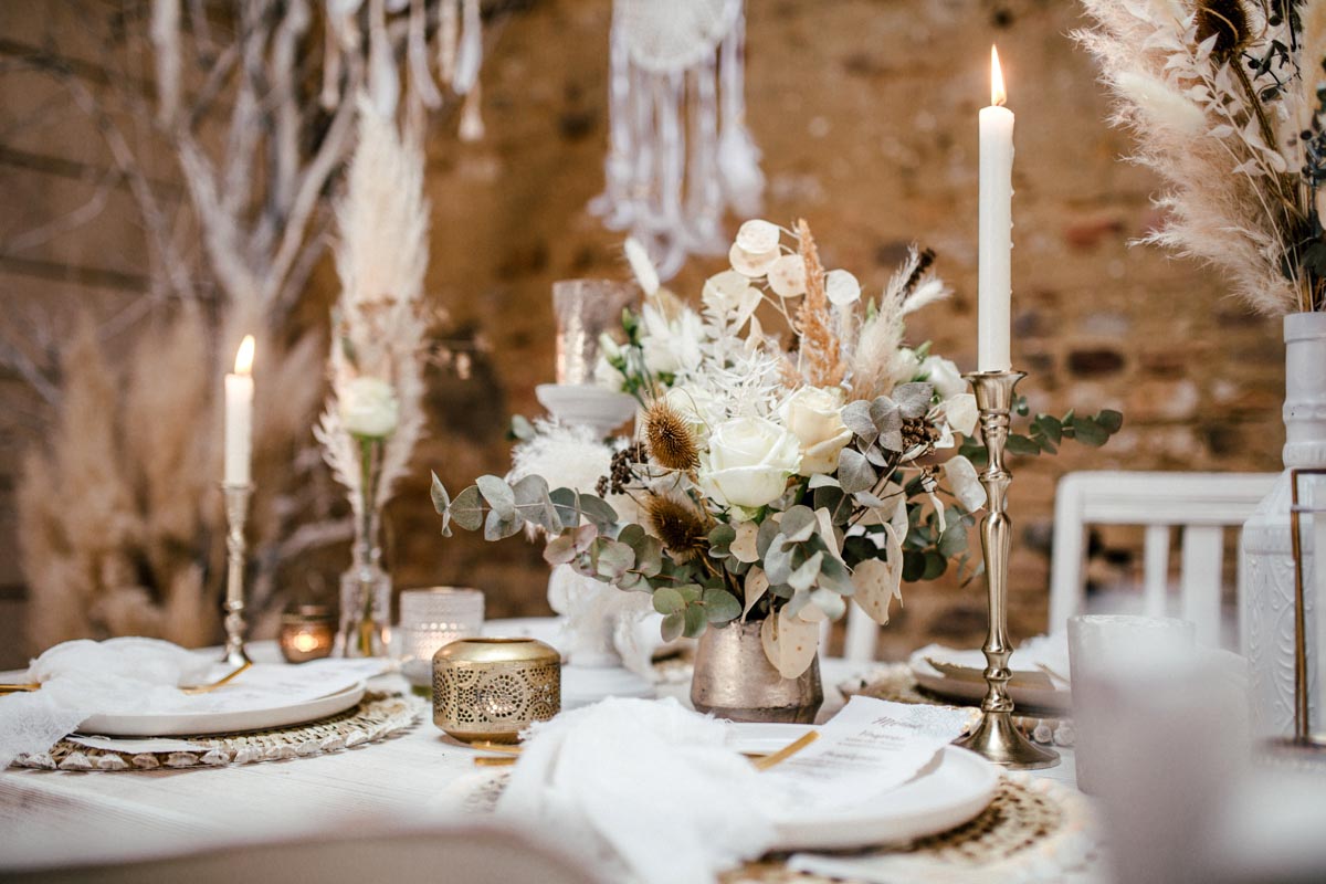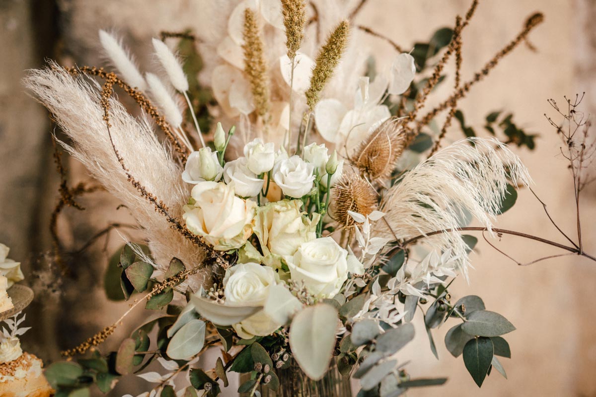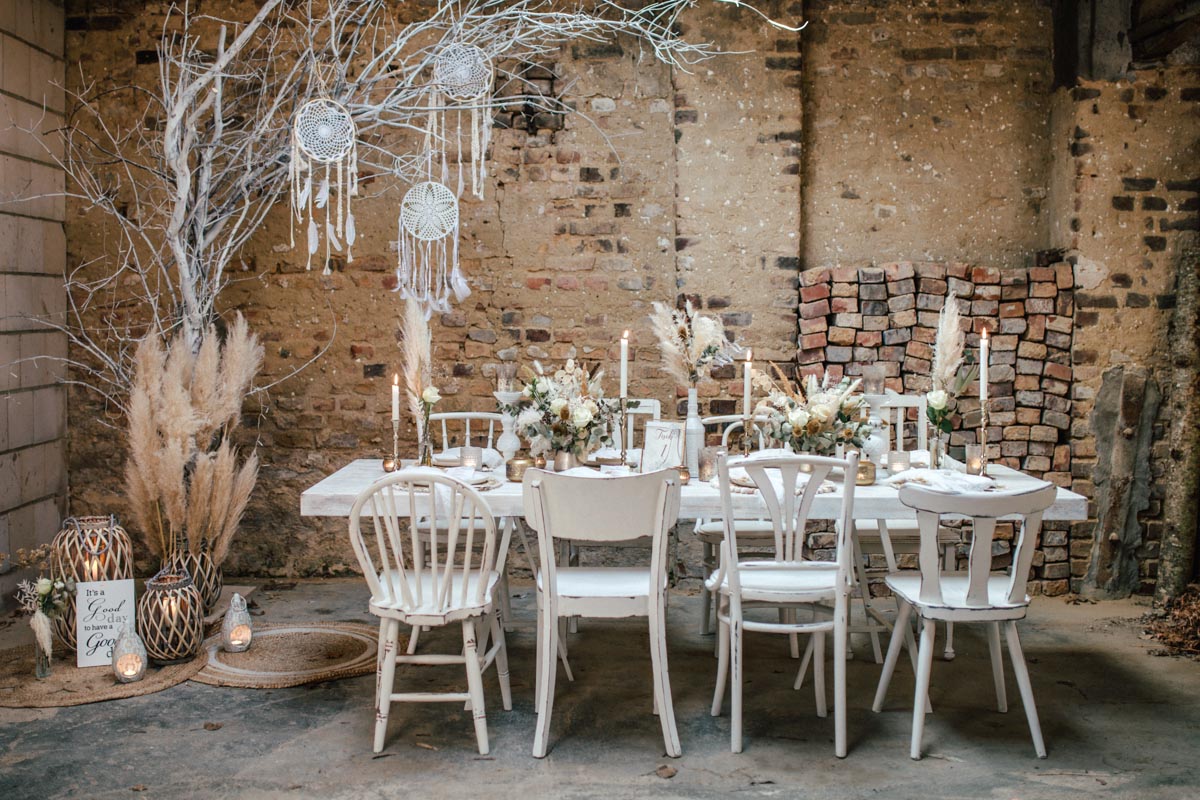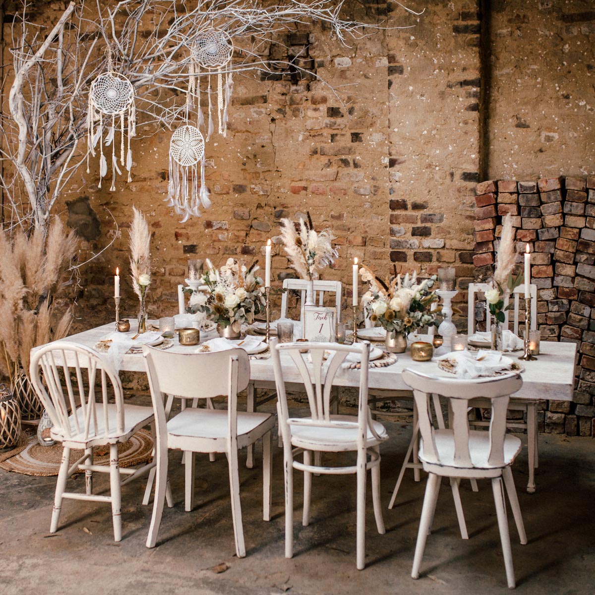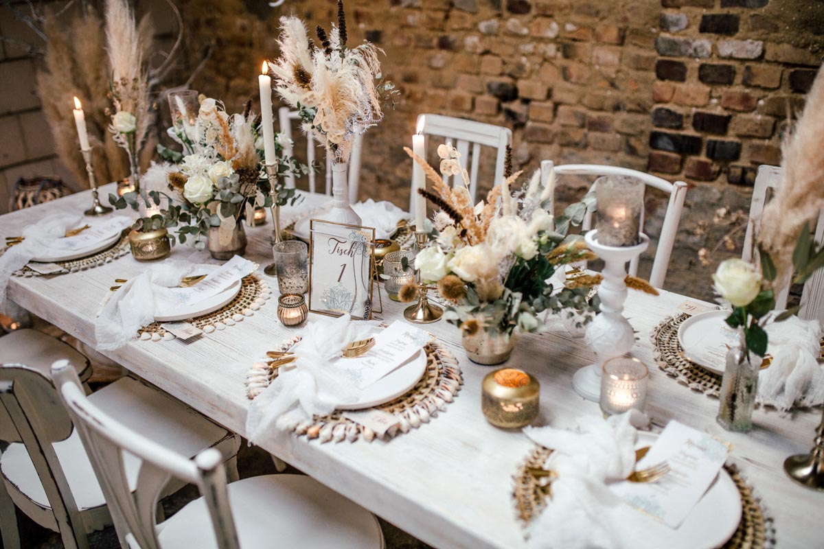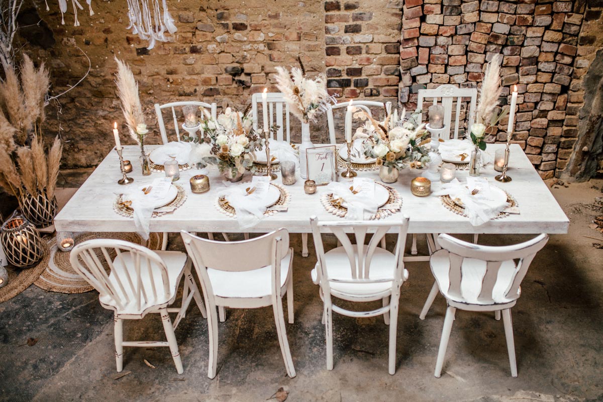 Sanftes Weiß, luftige Stoffe und feines Pampasgras verschmelzen mit liebevoll ausgewählten Vintage-Elementen. Zarte goldene Akzente setzen warme Highlights und lassen diesen Stil neu aufleben.