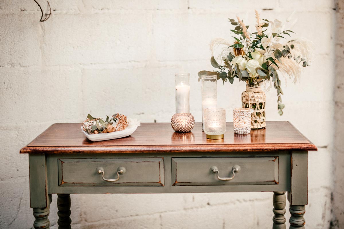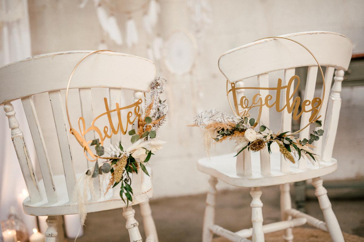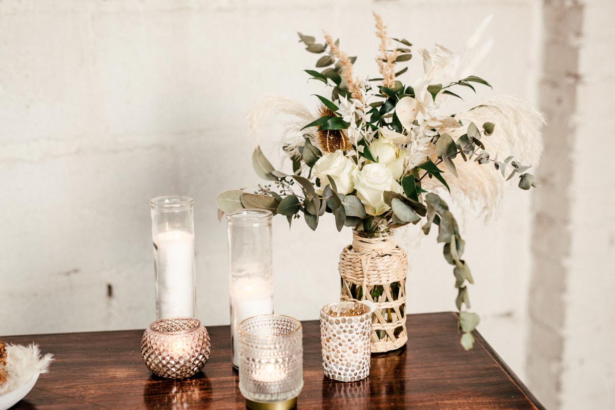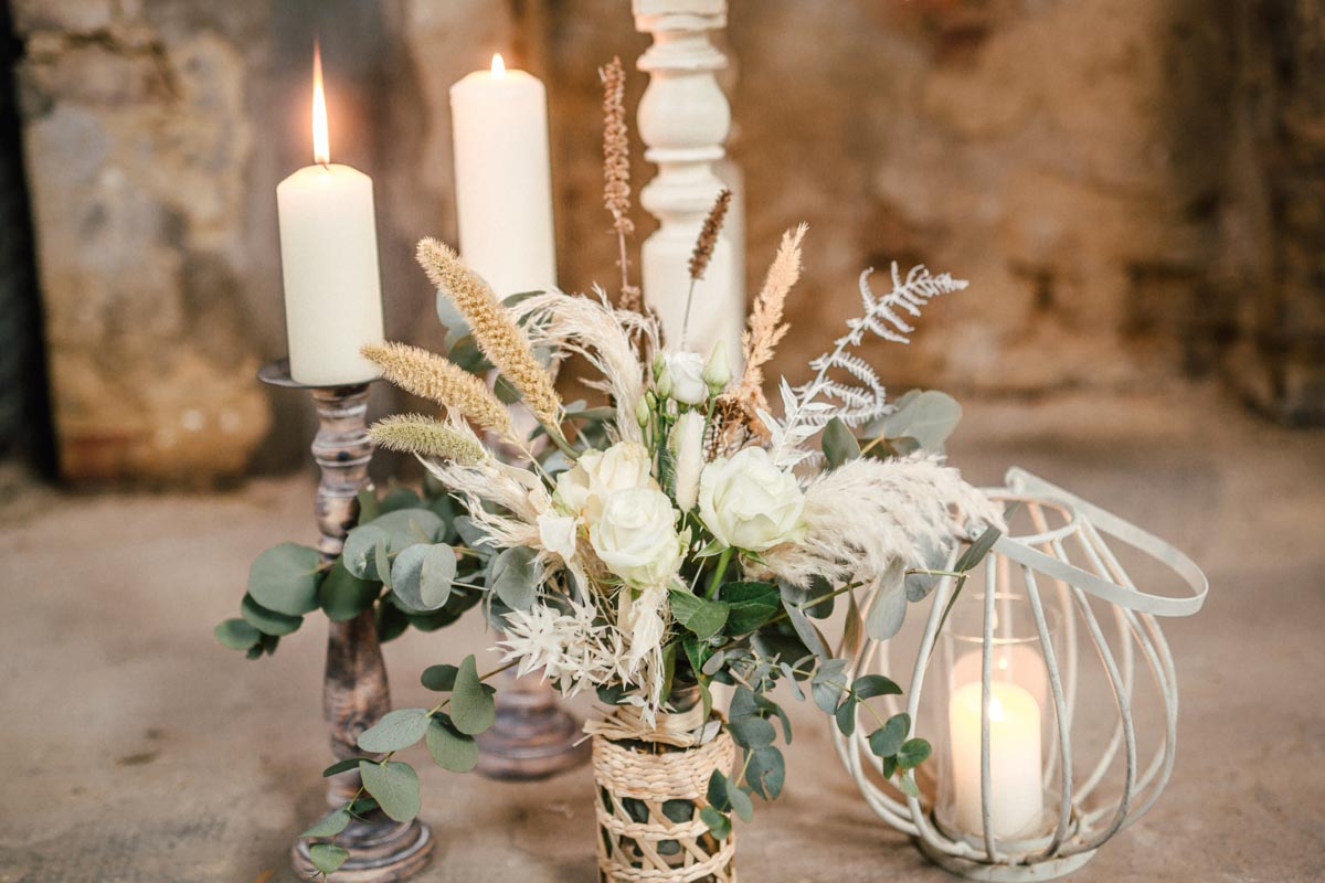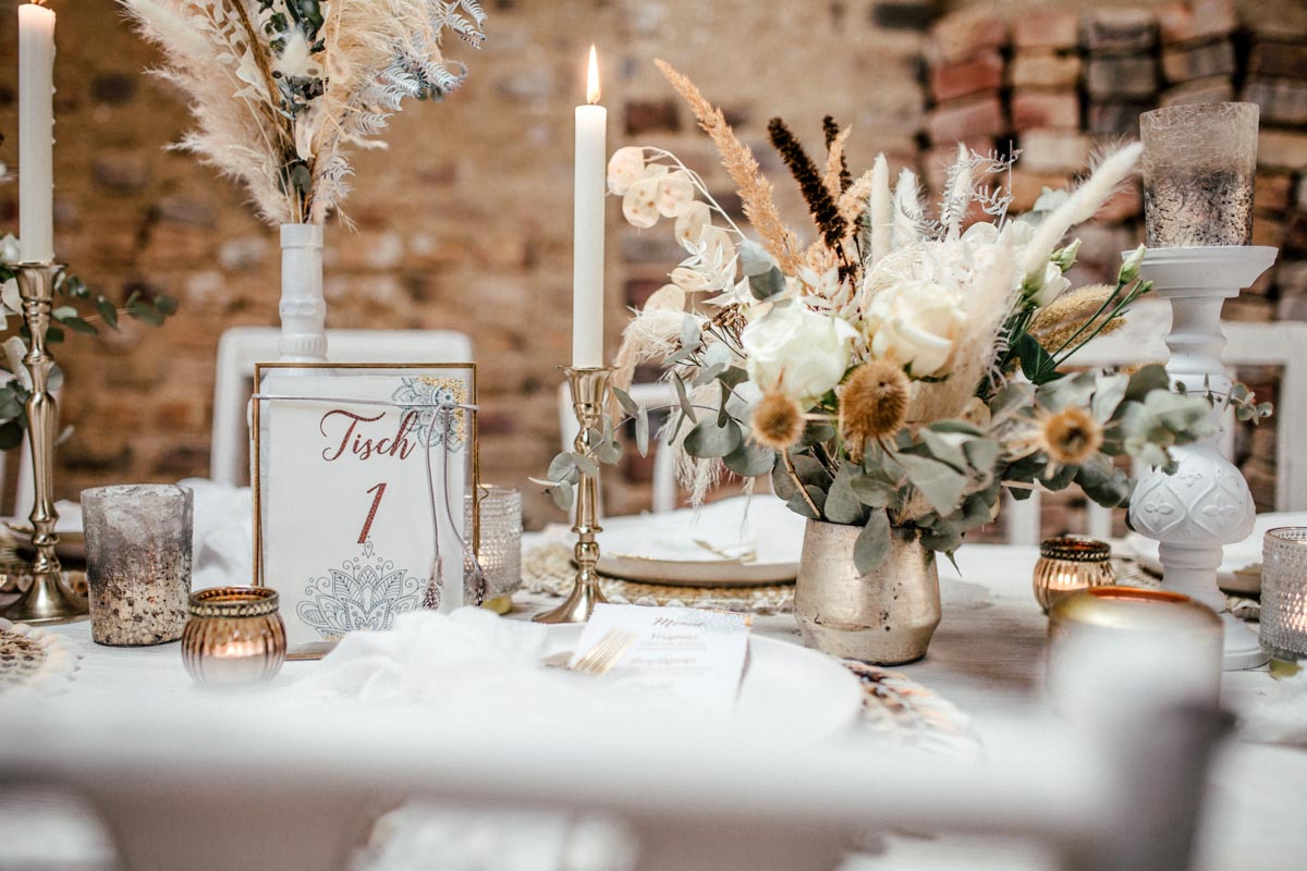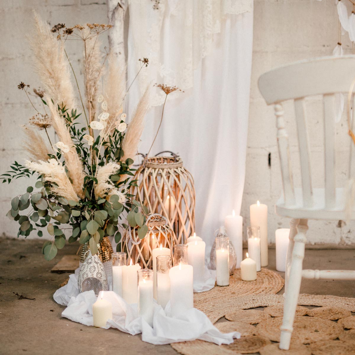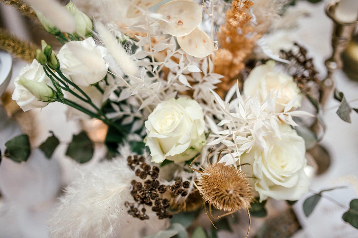 Sanftes Weiß, luftige Stoffe und feines Pampasgras verschmelzen mit liebevoll ausgewählten Vintage-Elementen. Zarte goldene Akzente setzen warme Highlights und lassen diesen Stil neu aufleben.